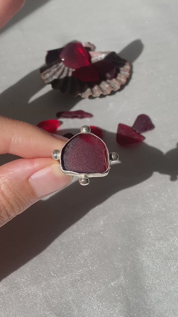 The Blood Moon features a nautical style design with silver ball accents facing north, east, south and west. She's a deep garnet red in the shade and beams a beauty deep wine in the sun. Ultra rare red sea glass is nature's most coveted treasure! Tumbled by ocean waves for decades, these frosted ruby gems make up less than 1% of all sea glass found. Fits a US size 6.