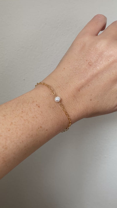 Simple and pure, this delicate bracelet features a single round baroque pearl which floats in the middle. Perfect for stacking or wearing on it's own, perfect for a beach picnic to elevate your outfit.