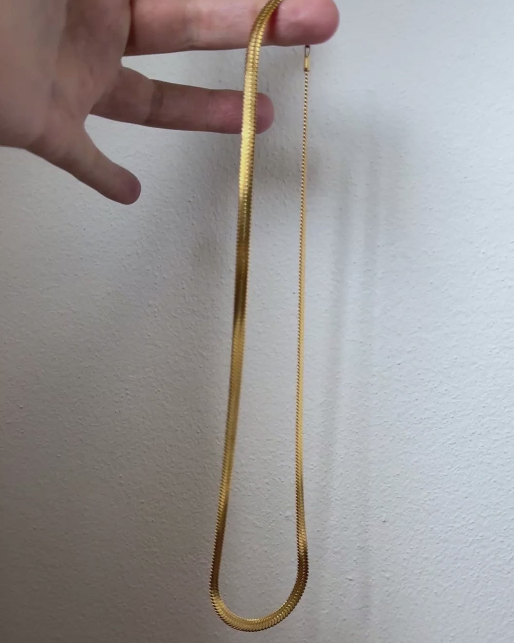 The Snake Chain Necklace is an essential addition to your collection. I've curated this chain for you to effortless layer with your other favorite pieces from my shop. Crafted with 18K gold plating stainless steel, the snake chain necklace is a sleek, slinky silhouette that resists tarnish and is hypoallergenic, waterproof and durable.